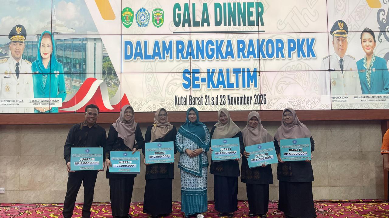 Secara simbolis, Mewakili Ketua TP PKK Kabupaten Ny. Ir. Hj. Siti Robiah Ardiansyah, Ketua I Bidang Pembinaan Karakter Keluarga TP PKK Kutim, Ny Masriati menerima penghargaan tersebut yang di berikan oleh Staf Ahli Bidang Pendidikan Keluarga TP PKK Kaltim Ny Wahyu Hernaningsih yang di berikan saat Gala Dinner Rapat Koordinasi (Rakor) TP PKK se Kaltim yang berlangsung di Auditorium Aji Tulur Jejangkat (ATJ), Kabupaten Kutai Barat, Jumat, (21/11/2025) malam.